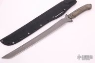 This custom fixed blade by Dennis Cook features a bead blasted blade with .250" blade stock and 1.286" blade depth, full tang construction. The handle has black canvas micarta scales. Includes a black kydex sheath. Has some light sheath marks, otherwise excellent condition.