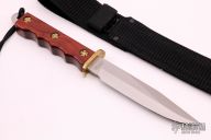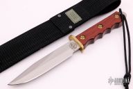 This EK Commando Bowie has a satin finished clip point blade with full tang and false top edge. Blade width .187", depth 1.265". Handle has a red wood grip with a brass guard and lanyard hole. Excellent condition. Comes with nylon sheath with velcro closure and belt loop and original box.