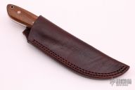 This drop point hunter by WF Steenkamp features a satin finished blade with fileworked thumbrest, .152" thickness and 1.231" depth, full tang construction. The handle has giraffe bone bolsters, wood scales with red liners and stainless and a mosaic pin. Comes with leather sheath and zippered case. Excellent condition.