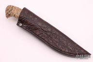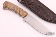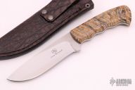 This "Hippo" by Arno Bernard is part of the "Giant" series of knives. This piece has mammoth tooth handle scales with black liners. Hand rubbed satin finish blade with .157" blade stock and 1.355" blade depth, full tapered tang construction. Includes a brown leather sheath. Excellent condition.