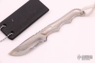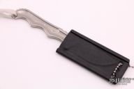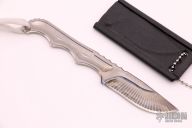 This custom titanium neck knife from Korth/Rick Lala features a satin finished and milled chisel ground blade, .105" blade stock and .780" blade depth. Two-part kydex sheath slides apart for cleaning. Ball chain for neck carry. Excellent condition.