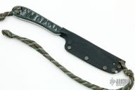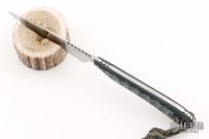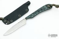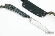 This Thin Neck Bowie from Fred Perrin features a clip point chisel ground blade with swedge, visible temper line and fileworked thumbrest, .112" blade stock and .670" blade depth, full tang construction. The handle is comprised of black/green/grey G-10 scales. Lanyard holes at the butt. Includes kydex sheath. Has some scratches, otherwise good condition.