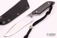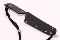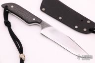 This Street Bowie from Fred Perrin features a clip point flat ground blade with swedge, visible temper, .219" blade stock and .928" blade depth, full tang construction. The handle carbon fiber scales. Lanyard holes at the butt. Includes kydex sheath. Has some scratches, otherwise good condition.