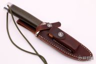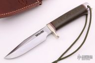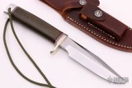 This Model 5-5 Camp and Trail by Randall Made Knives features a clip point satin finished blade with false top edge and a notched thumbrest, .195" blade stock, 1.145" blade depth, hidden tang construction. The handle has a nickel silver guard, green linen micarta grip, red/white/blue spacers, lanyard hole in the aluminum butt. Includes a brown leather sheath and original papers wrapping. New from maker.