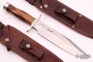 The Model 12-9 Sportsman Bowie by Randall Made Knives was made to meet the demand for a heavy-duty sporting knife of the Bowie type. This knife has a stainless steel blade with sharpened top edge, .232" blade stock and 1.723" blade depth, hidden tang construction. The handle has a nickel silver guard and butt, beautiful NASA G-3 commando style handle with black and duralumin spacers. Comes with a brown leather copper riveted sheath with "Challenger Mission Memorial" logo, a regular model C brown leather sheath, and original paper wrapping. New from maker.