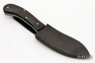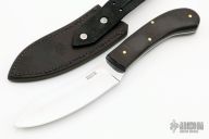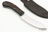 This Free Style Skinning Knife by Peter Bromley features a satin finished blade with .111" blade stock and 1.171" blade depth, full tang construction with ebony wood scales and brass pins. Comes with a black leather sheath. New from maker.