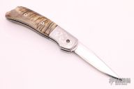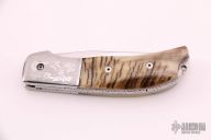 This side opening auto by Mike Whiskers features a satin finished clip point blade with a fileworked blade spine.  The handle has engraved steel bolsters, sheep horn scales over fileworked liners and backspring.  Scuffs/scratches are visible on the blade and  handle otherwise the knife is in good condition.