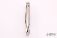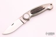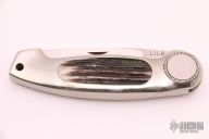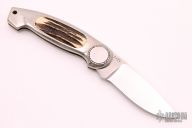 This Button Lock Folder from Jimmy Lile features a satin finished blade with nail nick, #242s on blade. The handle has an engraved nickel silver frame with stag inlays. Large button lock release mechanism used to open and close the knife. Numbered "92" on inside of backspacer. Has some light scratches, otherwise excellent condition.