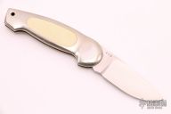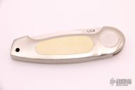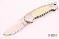 This Small Button Lock Folder from Jimmy Lile features a satin finished blade, #420 on blade. The handle has a nickel silver frame with ivory inlays. Large button lock release mechanism used to open and close the knife. Numbered "1987 U.S. Pat# 4148140" on inside of backspacer. Has some scratches, otherwise excellent condition.