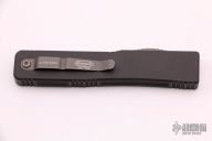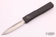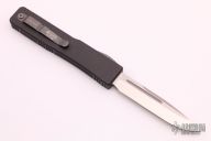 This Ultratech OTF automatic from Microtech features a satin finish single edge blade with swedge and fullers. The handle has a black anodized aluminum handle with stainless steel thumb slide and tip down clip. Dated 01/2002 with a serial number of 2271. Includes padded velcro case. Light scratches are visible on the handle otherwise the knife is in good condition.