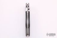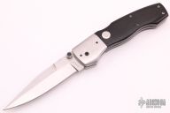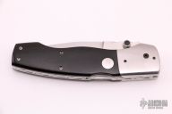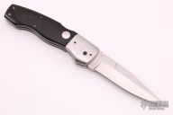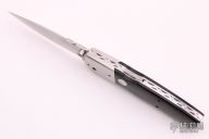This D/A lockback auto by Charlie Dake features a hand rub satin finished blade with false top edge and single black linen micarta inlaid thumbstud, fileworked blade spine. The handle has satin finished stainless steel dovetailed bolsters, black linen micarta scales, and stainless steel liners and backspacer with filework. Nice lockup, action and blade seating. #9451 on blade. Has some light scratches, otherwise excellent condition.