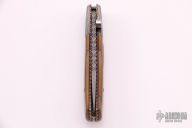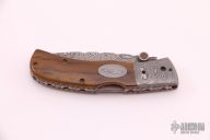 This D/A lockback auto by Charlie Dake features a Damascus blade with mammoth ivory inlaid thumbstud, fileworked blade spine. The handle has Damascus dovetailed bolsters, mammoth ivory scales, fileworked and heat colored stainless steel liners and backspacer with filework. Nice lockup, action and blade seating. #9706 on blade. Has some light scratches, otherwise excellent condition.
