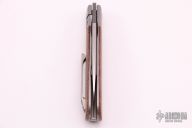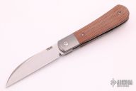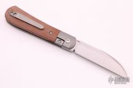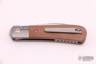 This Swayback Front Flipper by Enrique Pena features a satin finished blade with a front flipper and notched thumbrest. The handle has titanium bolsters, natural canvas micarta scales with a titanium backspacer and matching tip up pocket clip. Includes a Pena X-Series padded box. Has a couple light scuffs, otherwise excellent condition.