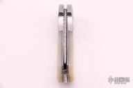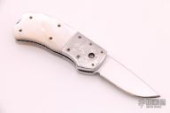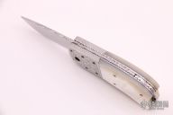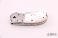 This Mike "Whiskers" Allen Scale Release Auto has a mirror polished stainless steel blade with fileworked spine. Scales are mother-of-pearl with engraved stainless steel dovetailed bolsters, filed stainless steel liners, filed stainless steel backspacer, lanyard hole at the butt. Beautiful piece. Nice action and blade seating, a little minor blade play. Light scratches are visible on the blade and handle otherwise the knife is in good condition.