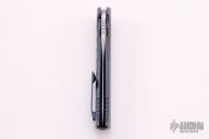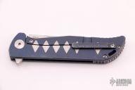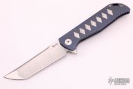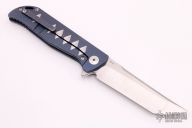 This K-2 from Reate Knives features a satin finished blade with false top edge, notched thumbrest and flipper. The handle has a milled and anodized titanium frame and tip up pocket clip, backspacer has been anodized blue. Nice detent, lockup and blade seating. Comes with nylon zippered case. Has some scuffs/scratches, otherwise good condition.