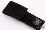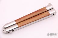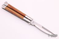 This early balisong features a Jody Samson ground satin finished blade with a sharpened top edge. The handles are stainless steel with wood inlays. Comes with a Velcro sheath and the original box. Has some scratches otherwise the knife is in excellent condition.