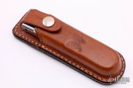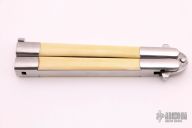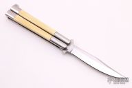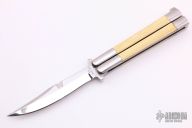 This early balisong features a Jody Samson ground mirror polished clip point blade. The handles are stainless steel with walrus ivory inlays. Comes with a brown leather sheath. The inlays are separating for the frames. Has some light scratches, otherwise excellent condition.