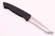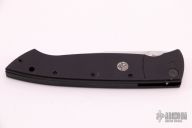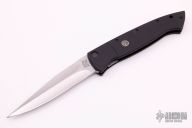 This automatic is a collaboration between Walter Brend and Woodard knives. The Brend flag emblem is on the blade face side and Woodard's WK (Woodard Knives) USA shield is on the frame. The blade is hand-ground by Walter Brend and hand rub satin finished. Black aluminum frame. Strong coil-spring automatic action. Perfect function. The frame has some light scuffs, otherwise excellent condition.