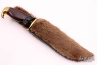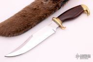 This Bowie Fighter by the Late Tiny Spencer features a mirror polished blade with false top edge, .188" blade stock and 1.533" blade depth, hidden tang construction. The handle has a brass guard and butt with a desert ironwood burl grip. Excellent condition. Comes with a black leather sheath with mink fur overlay.