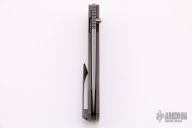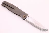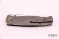This Strizh by Alexander Cheberkov features a San Mai Damascus blade with notched thumbrest and a single thumbstud. The handle has a bronzed titanium frame with bronzed hardware and inlaid liner, matching backspacer and tip up clip with hidden screws. Comes with original box and papers. Dated 2018. Has some scuffs and scratches, otherwise good condition.