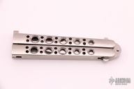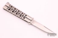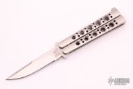 This is a Benchmade Model 10S Bali-Song with a tumbled blade. The handles are stainless steel with a T-latch. Has a few light scratches, otherwise excellent condition. Comes with original sheath.