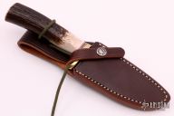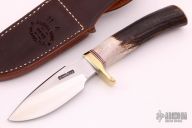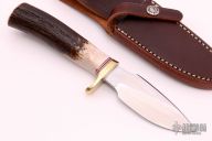 The Model 11 is the original drop-point blade. Designed by Tommy Thompson, noted Alaskan guide, in 1952 for big-game skinning, with point dropped below top of blade to prevent cutting too deeply through skins when used point first. This knife has a carbon steel blade with notched thumbrest, .156" blade stock and 1.275" blade depth, hidden tang construction. The handle has a brass guard, stag grip, and red/white/blue spacers. Comes with a brown leather sheath and original paper wrapping. New from maker.