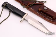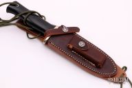 This Model 15-5.5 Airman by Randall Made Knives features a satin finished clip point blade with sharpened top edge, .231" blade stock and 1.222" blade depth, full tang construction. Notice the curved grind on the clip point edge, it is usually straight, this one has a cool look. The handle is comprised of a nickel silver single guard and black linen micarta grip over full tang construction. Brass lanyard tube with lanyard in pommel. Includes brown leather sheath with belt loop and sharpening stone, comes with original paper wrapping. New from maker.
