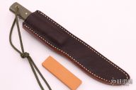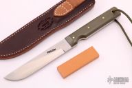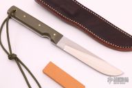 This Model 10 Salt Fisherman and Household Utility features a satin finish drop point blade with swedge and notched thumbrest, .136" blade stock and .924" blade depth. The handle is comprised of green G-10 scales over full tang construction. Brass lanyard tube with lanyard in pommel. Includes a brown leather sheath and original paper wrapping. New from maker.