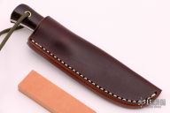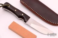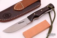 This Model 10 Salt Fisherman and Household Utility features a satin finish blade with notched thumb rest. 0.127" blade stock and 0.917" blade depth. The handle is comprised of rosewood scales over full tang construction. Brass lanyard tube with lanyard in pommel. Includes a brown leather sheath, sharpening stone and original paper wrapping. New from maker.