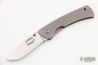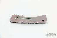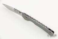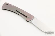 This knife by Dick Atkinson features a hand rub satin finished blade with fileworked spine and single thumbstud. The handle has a thin anodized titanium frame with fileworked stainless steel backspacer. Has a few light scratches, otherwise excellent condition.