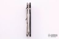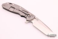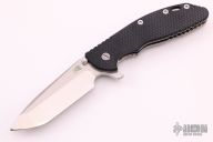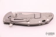 This XM-24 by Hinderer Knives features a stonewashed drop point blade with notched thumbrest and flipper. The handle has a textured black G-10 scale with tumbled titanium liner and frame, tip up or down reversible titanium clip. Nice detent, lockup and blade seating. Has some light scratches, has been resharpened, otherwise excellent condition.