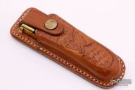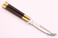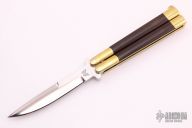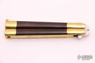This Balisong features a Weehawk blade ground by Jody Samson. The handle is comprised of integral dovetailed brass handles with black canvas micarta inlays. Brass T latch on pommel. Comes with original leather sheath but the snap is broken. Has a few VERY light scratches, otherwise excellent condition. Probably the cleanest one I have ever seen.