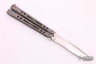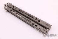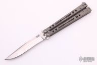 This Specter Balisong from Jerry Hom features a satin finish recurve blade with swedge. The handle is comprised of bead blasted and skeletonized titanium handles with satin titanium backspacers and T latch. Includes original box and paperwork. Excellent condition.