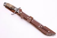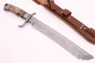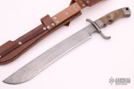 This Custom Bolo by MCS Woods features a recurve blade that looks like it has hand filed bevels, .248" blade stock and 1.643" blade depth, full tang construction. The handle has a steel S-guard and front and rear bolsters, maple scales, lanyard hole in the butt. Comes with a heavy-duty brown leather sheath. Excellent condition.