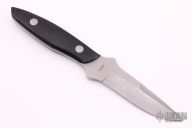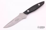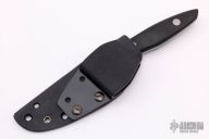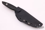 This knife by Bill Sanders features a bead blast finished blade with sharpened top edge, .127" blade stock and .910" blade depth, full tang construction. The handle has rag black paper micarta scales with stainless pins. Comes with a kydex sheath. "023F4" on back of blade. Has some scratches, otherwise good condition.