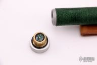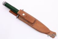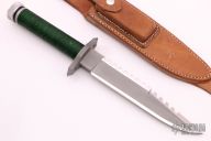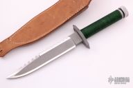 This "Sly II" by Wall Knives features a bead blasted blade with sawteeth on the spine and false top edge, .269" blade stock and 1.326" blade depth. The has a blasted stainless steel guard, hollow aluminum handle with green nylon cord wrap, has removable aluminum butt cap with compass. Comes with brown leather sheath. Has some scratches, otherwise excellent condition.