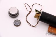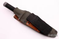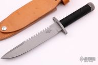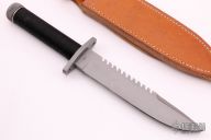 This survival knife by Bill Sanders features a bead blasted spear point blade with sharpened top edge and 10 saw-teeth on blade spine. 1/4" blade stock and 1.303" blade depth, hidden tang construction. The handle has a stainless steel double guard, hollow cord wrapped handle, and stainless steel removable butt cap with an O-ring to make it water-proof. Comes with brown leather sheath that has a honing stone pouch in the sheath. Comes with a custom kydex sheath. Inside the handle is a roll-up kit with a fire stick, rolled up cord, rolled up fishing line, and hook holder with a tied fly and 4 extra hooks and 2 split-shot weights. The roll-up kit has two extra, unused slots for extra survival items. The cord that is around the handle is cord that can be removed for survival use. The removable butt cap has a polished flat inside that can be used for signaling. The blade is stamped "057S3". This knife was well-thought-out and provides everything possible for survival. Has some scratches, also had a heavy coat of Renaissance Wax, which I did not fully remove, otherwise excellent condition.
