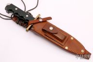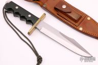 This M25 Fighter from Colin Cox features a satin finished blade with sharpened top edge, green tenite canvas micarta handle over full tang construction with .255" blade thickness and 1.414" blade depth. Brass double guard. Includes a brown leather sheath. Excellent condition.