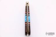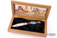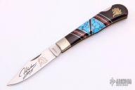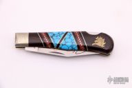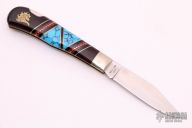 This Custom Lockback by United Cutlery has a custom handle by David Yellowhorse and is from a limited edition of 600 pieces, this one is #475. The handle has nickel silver bolsters, ironwood, turquoise, red and black spiny oyster shell and nickel silver spacers, brass liners and stainless steel backspacer. Comes with original wooden display box. Excellent condition.