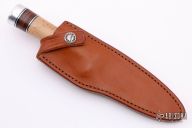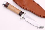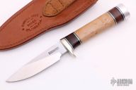 This Model 26 Pathfinder by Randall Made Knives is one of Randall's best selling models. It features a drop point satin finished blade with .156" blade stock and .914" blade depth, hidden tang construction. The handle has a nickel silver guard and duralumin butt, maple grip and black/duralumin/leather spacers. Comes with a brown leather sheath. Excellent condition.