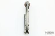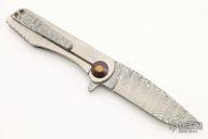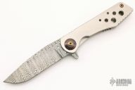 This knife by Jurgen Schanz features a Damascus drop point blade with flipper. The handle has an orange peel finished titanium frame, MokuTi pivot collars, bronzed hardware, tip up Damascus clip. Nice detent, lockup and blade seating. Rides on bearings. Comes with a zippered case. Excellent condition.