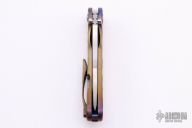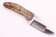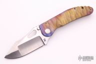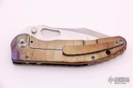 This One Off Saurus from Damjan Knives features a clip point satin finished compound ground blade with swedge and thumbhole. The handle has an anodized and textured titanium frame and backspacer with matching tip up clip. Great blade seating, detent and lock up. Comes with a zippered case and COA dated May 8, 2017. Excellent condition.
