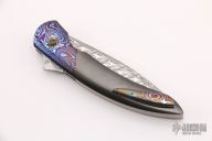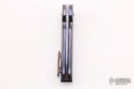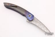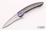 This Link Linerlock Flipper by Glenn Are Hovin features a Damasteel blade with false top edge and flipper. The handle has mokuti bolsters, custom milled pivot, zirconium scales, titanium liners with jeweled interiors, mokuti backspacer, tip up mokuti pocket clip with hidden screws. This knife's only hardware visible is the pivot, every other screw on the knife is hidden, pretty impressive and clean. Nice detent, lockup and blade seating. Comes with zippered case. Excellent Condition.