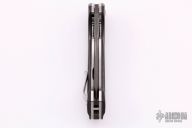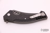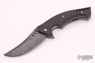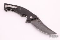 This Mamba flipper by Walter Brend is a Joel Pirela design features a stainless Damascus blade with notched thumbrest and flipper. Carbon Fiber scales, titanium liners, carbon fiber backspacer, and a tip up titanium clip dated 06/14. Smooth function with a nice lock, detent and blade seating dead center. Rides on bearings. Hidden lanyard pin at the butt. Comes with original box, velcro case and papers. Excellent condition. One of only 20. Comes with a hand signed letter from Walter Brend.