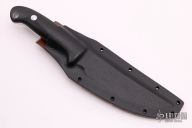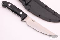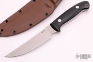 This skinner from Dan Crotts features a satin finish upswept blade. .122" blade stock and 1.181" blade depth. The handle features black micarta scales, red liners, aluminum pins and lanyard tube over a full tang construction. Includes kydex sheath with belt loop set up for vertical carry. New from maker.