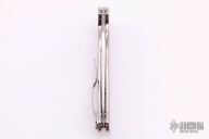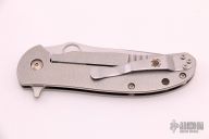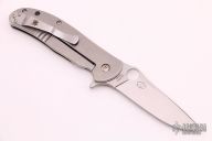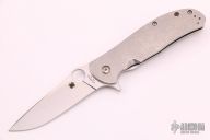 This C214TIP Advocate is a Gayle Bradley design executed by Spyderco. It features a satin finished drop point blade with thumb hole, notched thumb ramp and flipper. The handle is comprised of an orange peeled titanium frame over barrel spacers with a steel tip up clip that is reversible for right or left hand carry. Steel lock face insert and lanyard hole in pommel. Includes original box and papers. Excellent condition.