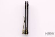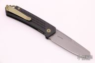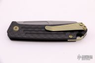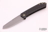 This OEM Slim is a Richard Rogers Design and features a bead blasted blade. The handle is milled carbon fiber with anodized titanium backspacer, hardware and tip up clip. Nice detent, lockup and blade seating. Comes with original packaging and brown leather slip sheath. New condition.