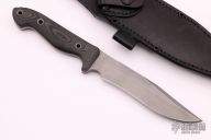 This Proteus by Vehement Knives features a bead blast finished clip point recurve blade with false top edge and notched thumbrest, .189" blade stock and 1.240" blade depth, full tang construction. The handle has black linen micarta scales, hollow tube pins and brass lanyard hole. Comes with black leather sheath. Excellent condition.