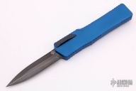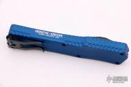 This Cleric OTF by Heretic Knives features a black double-edged blade. The handle has a blue aluminum frame with a stepped and DLC coated stainless steel thumbslide and tip down clip. Comes with original box and papers.  S/N 01275.  Excellent Condition.