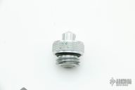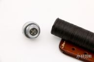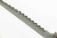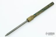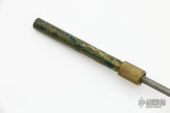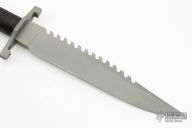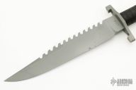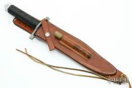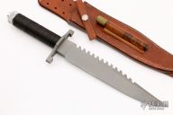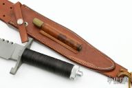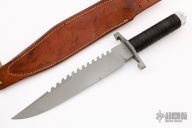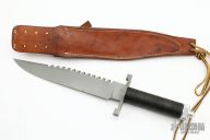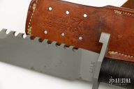 This Sly II has the Lile stamp with NO-dot and was custom made with 12 saw teeth. The Sly II was designed by Jimmy Lile to meet the demand for his famous "First Blood" knives. This knife has a 9" bead blasted blade with 12 saw teeth (8 double split teeth and 4 single), .243" blade thickness and 1.490" blade depth. The stainless steel handle is waterproof, foam wrapped, and hollow. The aluminum butt cap unscrews to reveal a compass, and allows you to use the hollow handle for storage. Comes with a brown leather sheath with sharpening steel. Has a light stain on the blade, otherwise excellent condition.